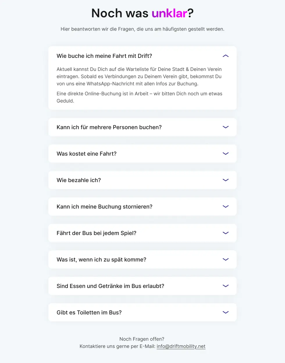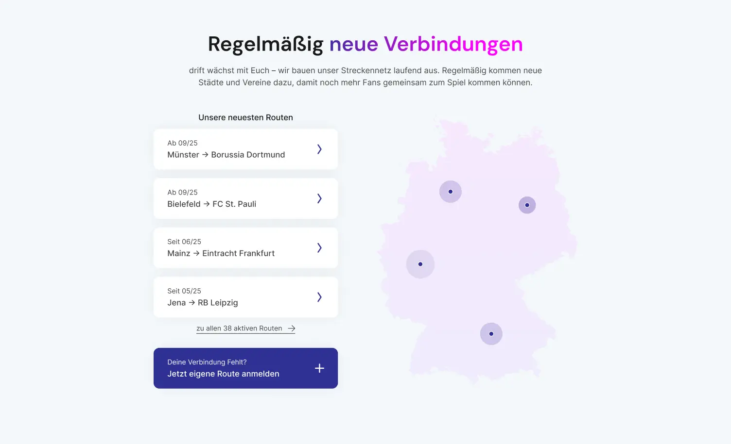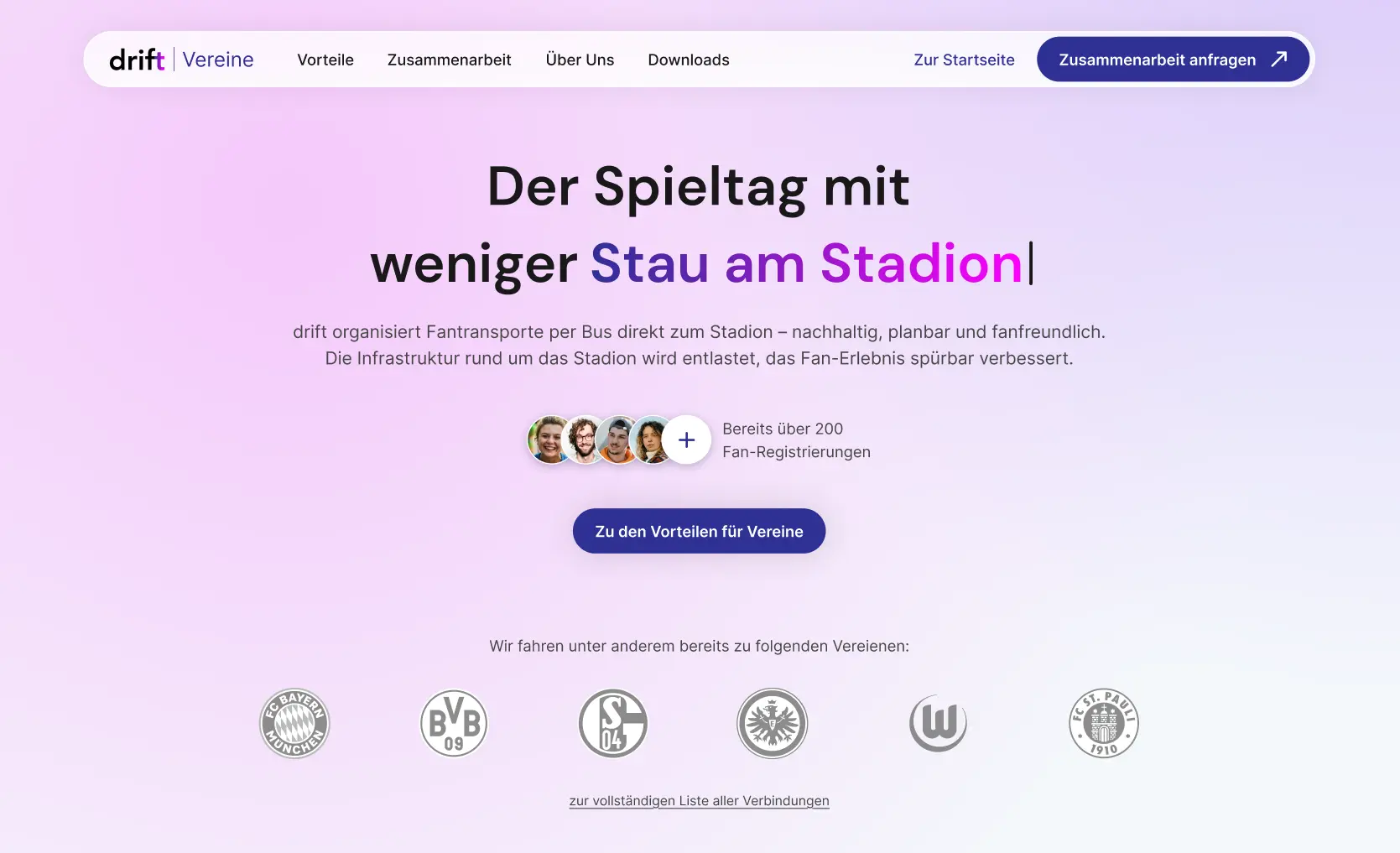 drift mobility ist ein Startup, das Fans per Bus direkt und zuverlässig zu Fußballstadien bringt. Für den Markteintritt habe ich den ersten professionellen Webauftritt gestaltet und umgesetzt: einerseits für Fans (B2C), andererseits für Vereine (B2B), die mit drift bei der Organisation nachhaltiger Anreisen zusammenarbeiten können.