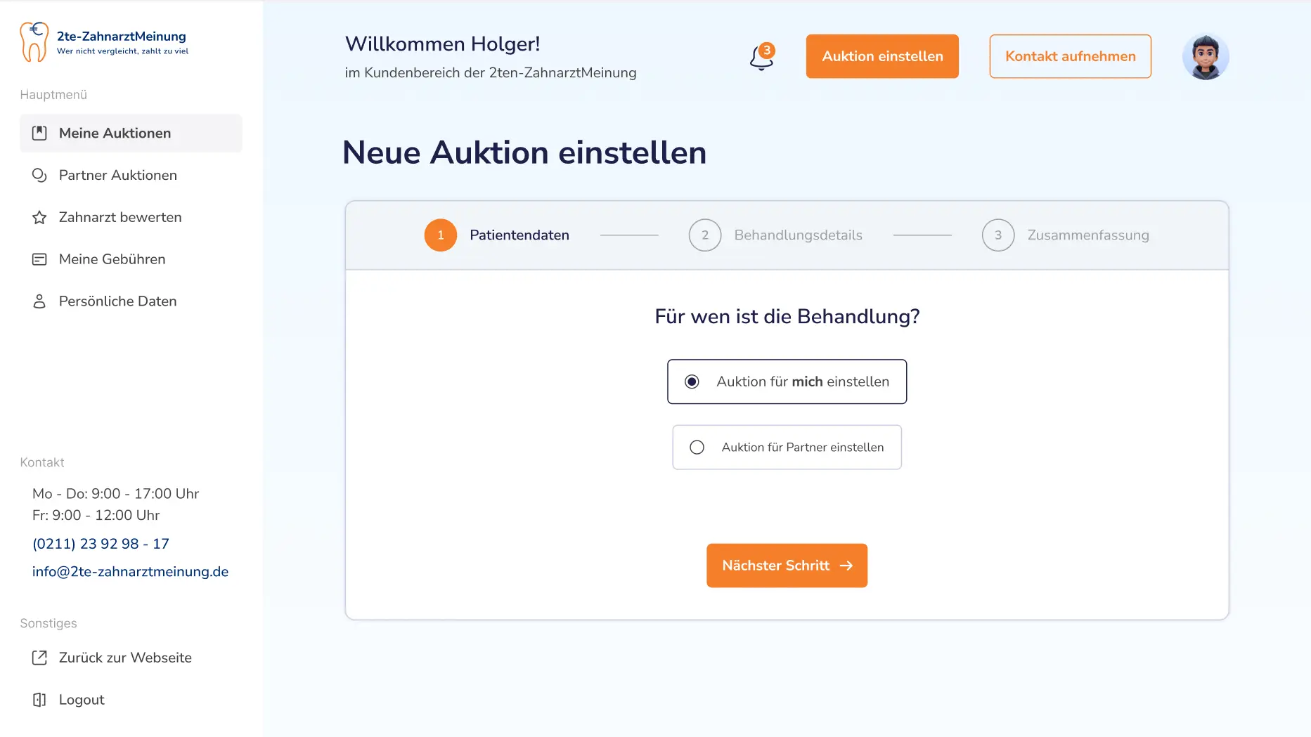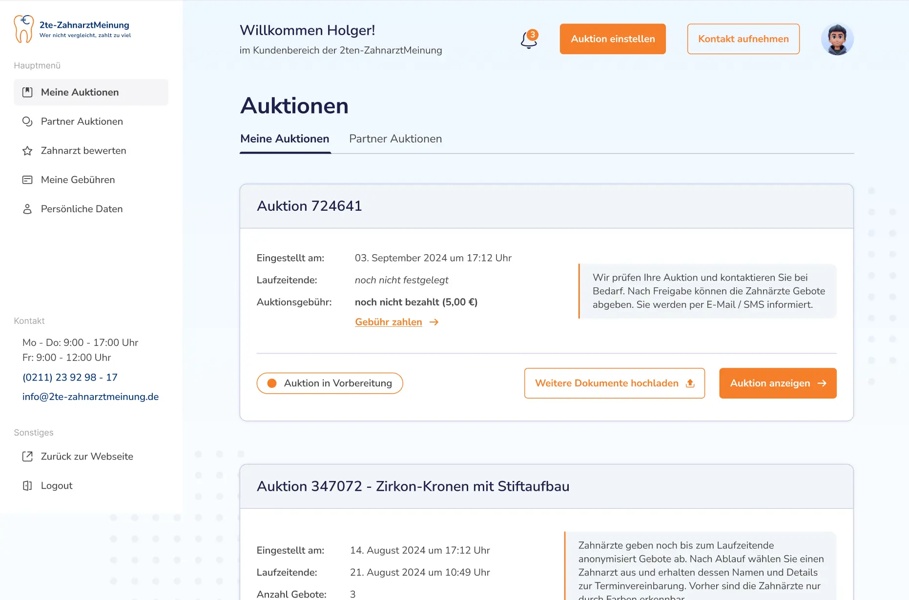 Das Portal besteht aus zwei Bereichen: einem Patientenportal, in dem Nutzer ihre Unterlagen hochladen und Auktionen verwalten, sowie einem Zahnarztportal, über das Zahnärzte Angebote abgeben und mit den Patienten in Kontakt treten können. Für beide Zielgruppen habe ich eine konsistente, intuitive Nutzeroberfläche entwickelt, die Prozesse vereinfacht und Vertrauen schafft.
