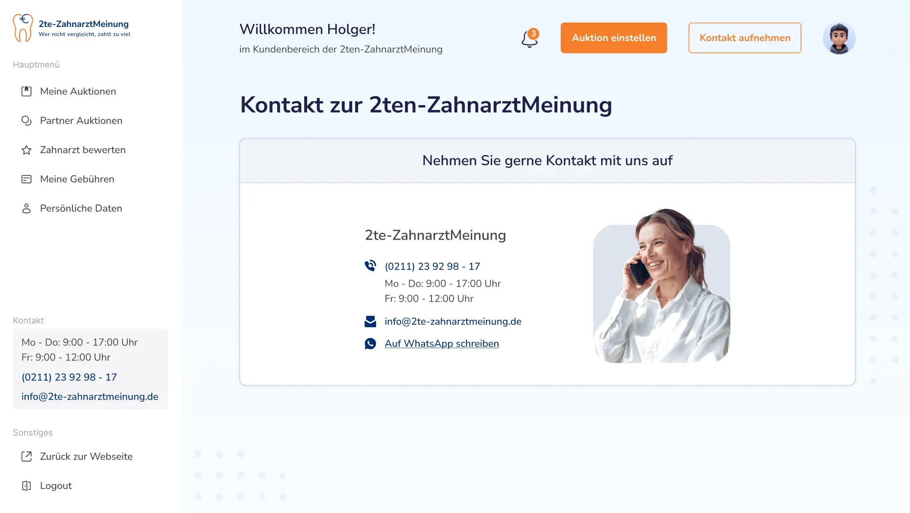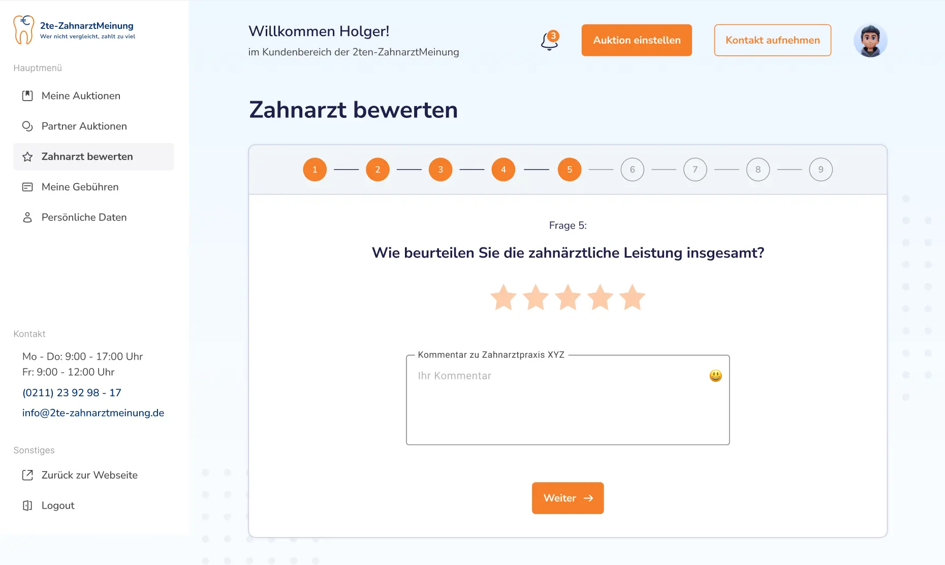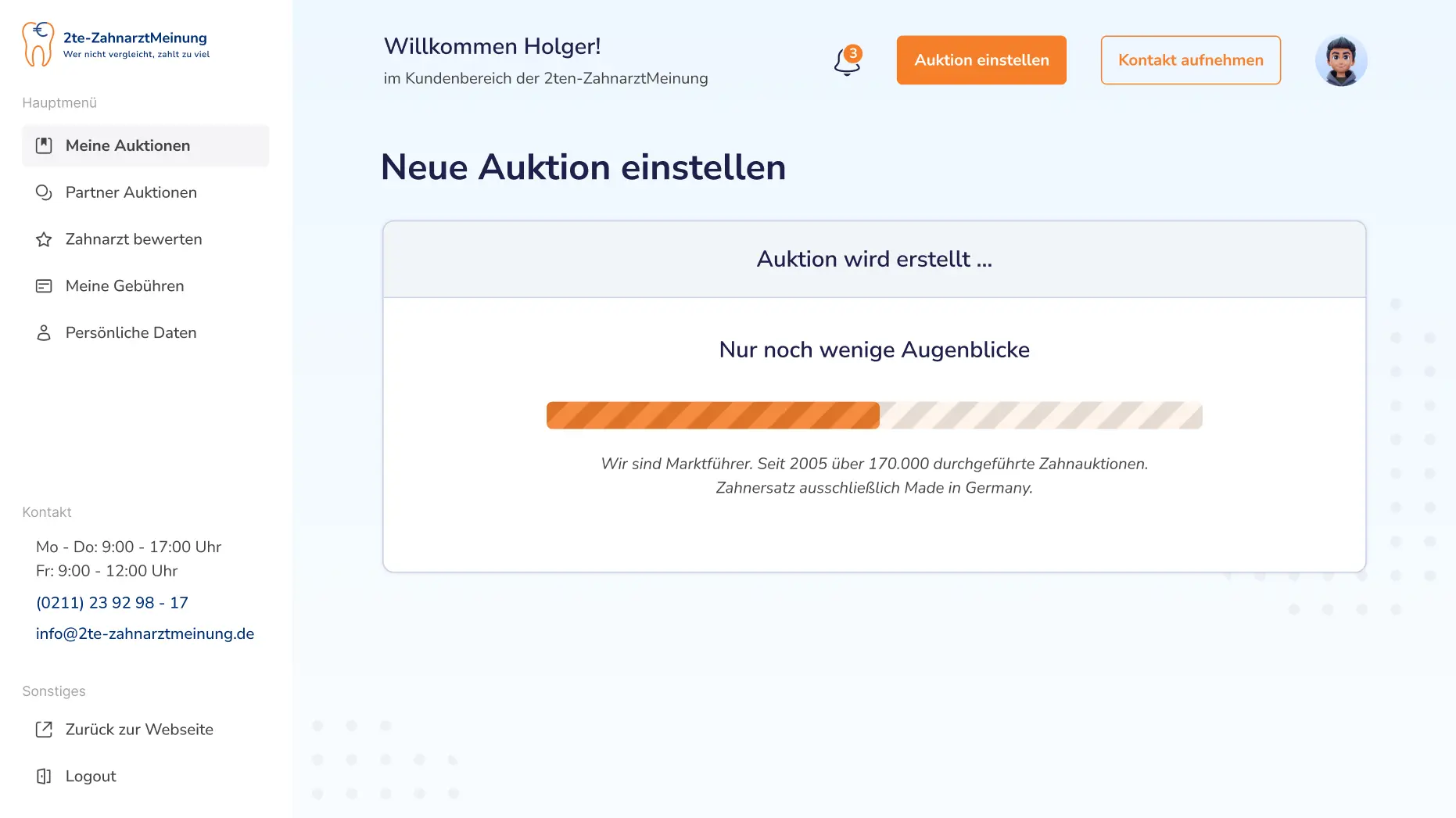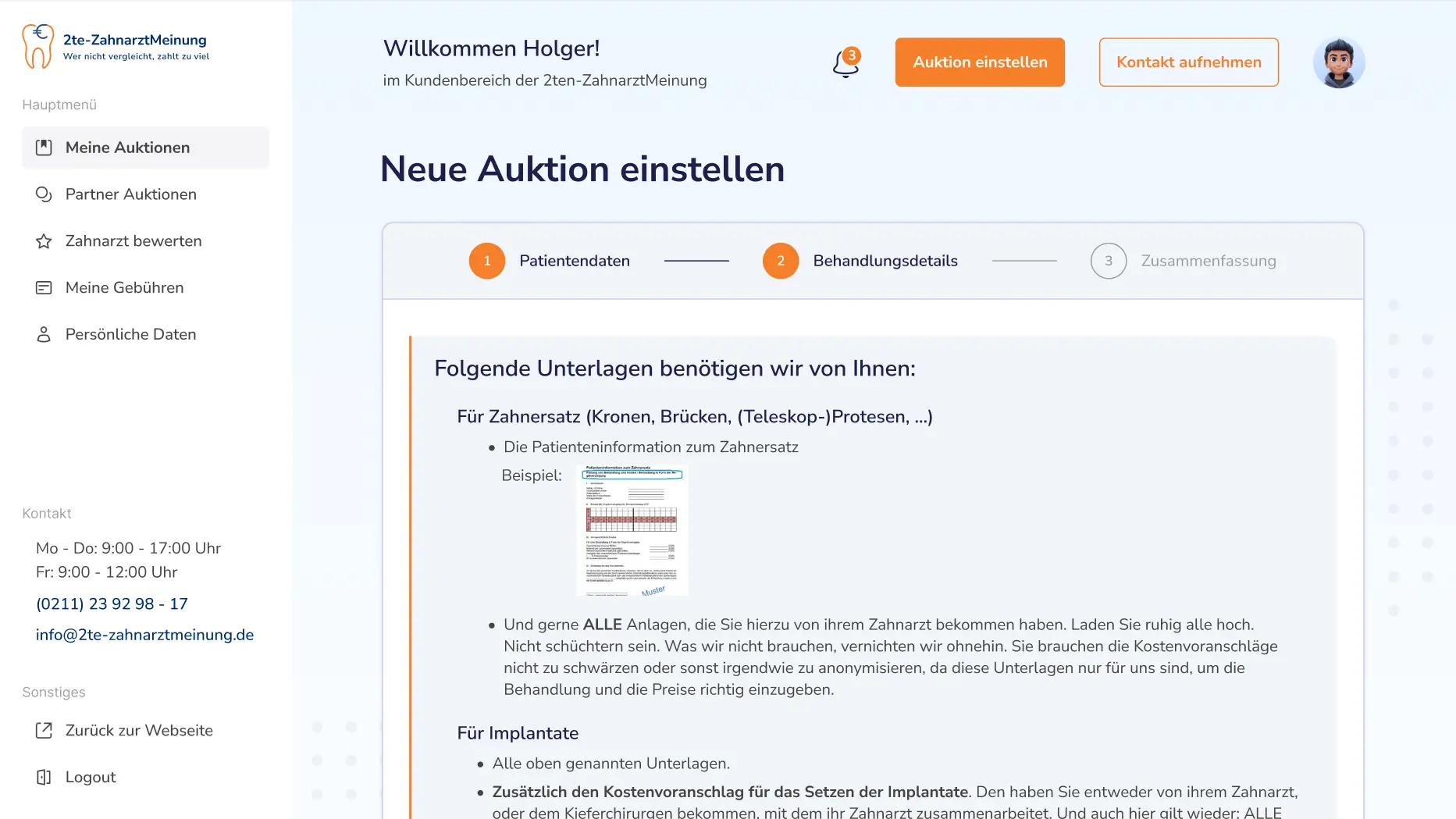 Aufbauend auf dem Corporate Identity und Marketing-Redesign habe ich das interne Portal der 2ten-ZahnarztMeinung komplett neu konzipiert und gestaltet. Kernaufgabe war es, die komplexen Abläufe einer Zahnarztauktion – vom Einstellen des Heil- und Kostenplans bis hin zu den Geboten der Zahnärzte – in ein klares, einfach verständliches UI Design zu übersetzen.