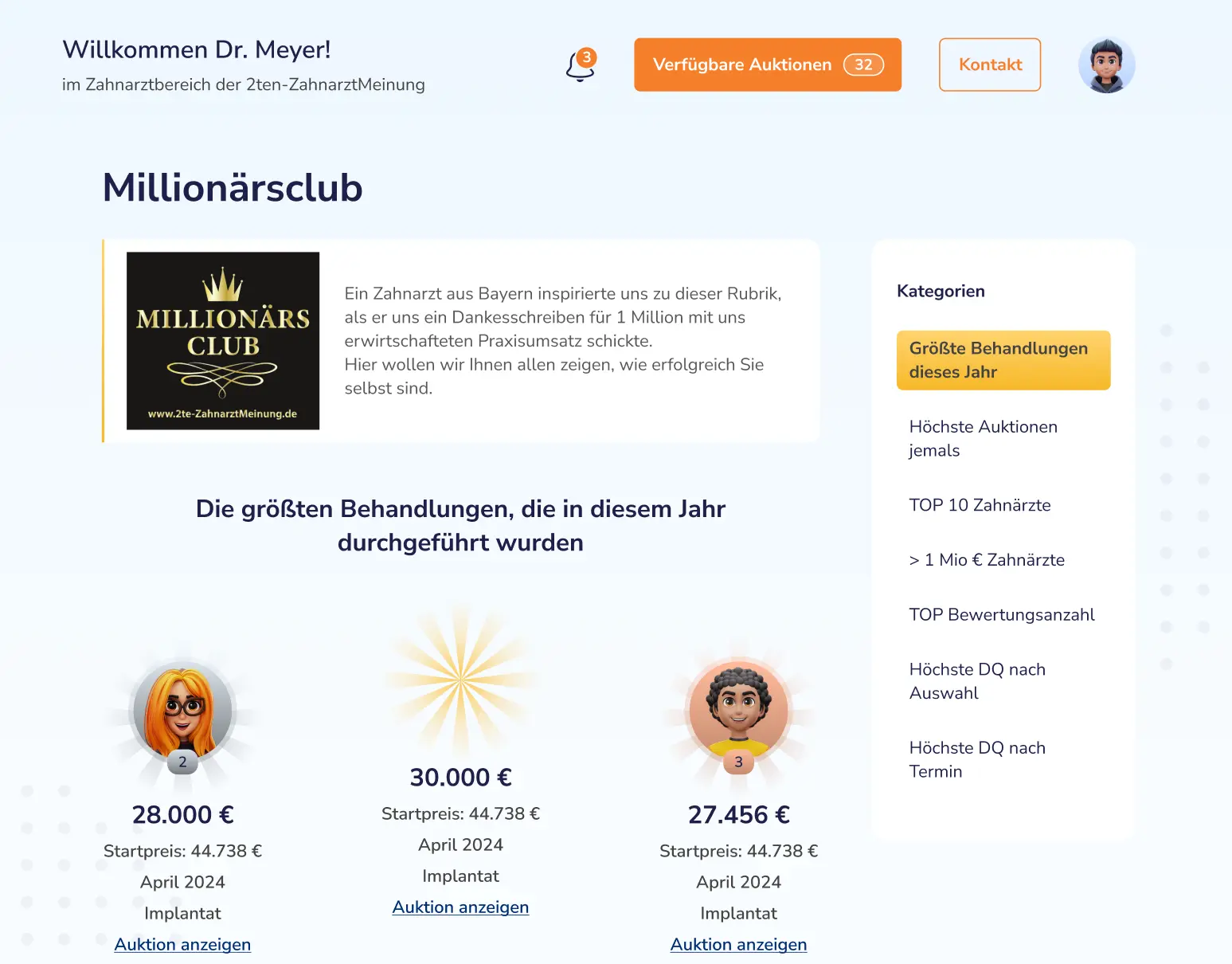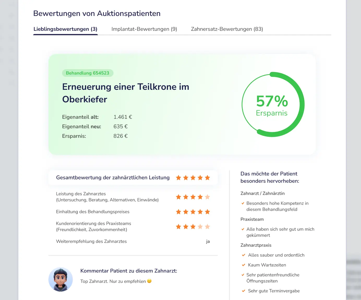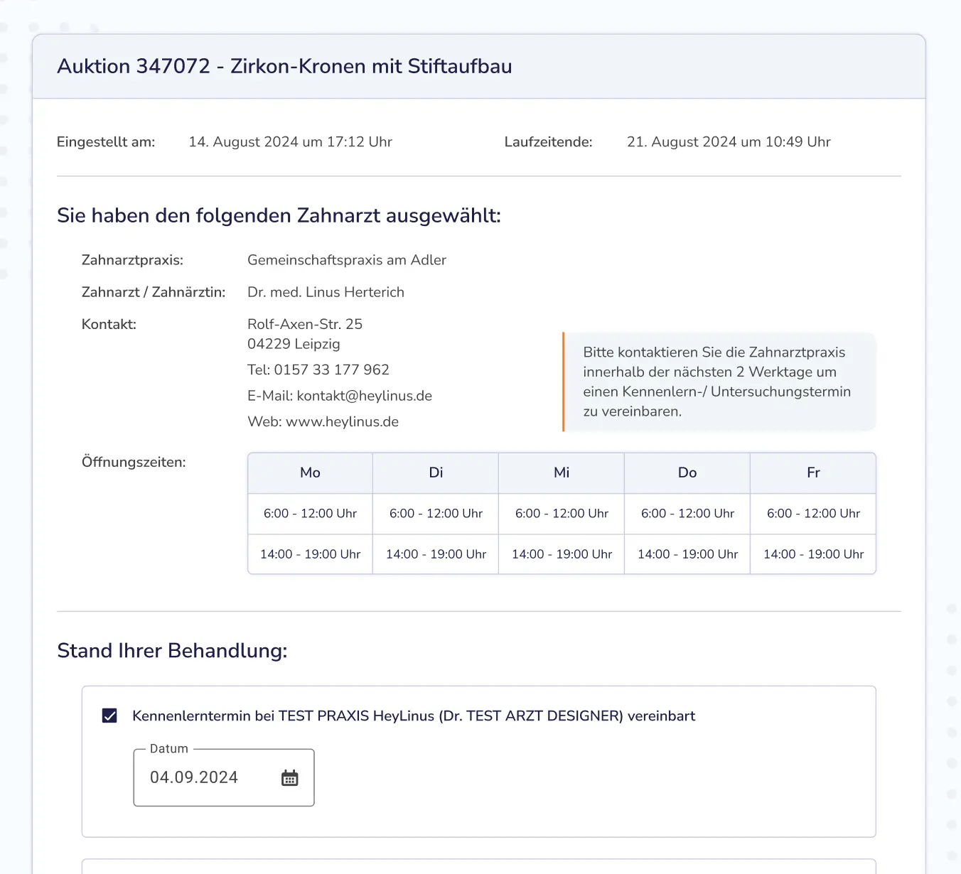 Das Ergebnis ist ein benutzerfreundliches Auktionsportal, das Patienten Orientierung bietet und Zahnärzten effiziente Werkzeuge für die Abgabe ihrer Angebote an die Hand gibt – und damit den Kern des Geschäftsmodells von 2te-ZahnarztMeinung optimal unterstützt.
